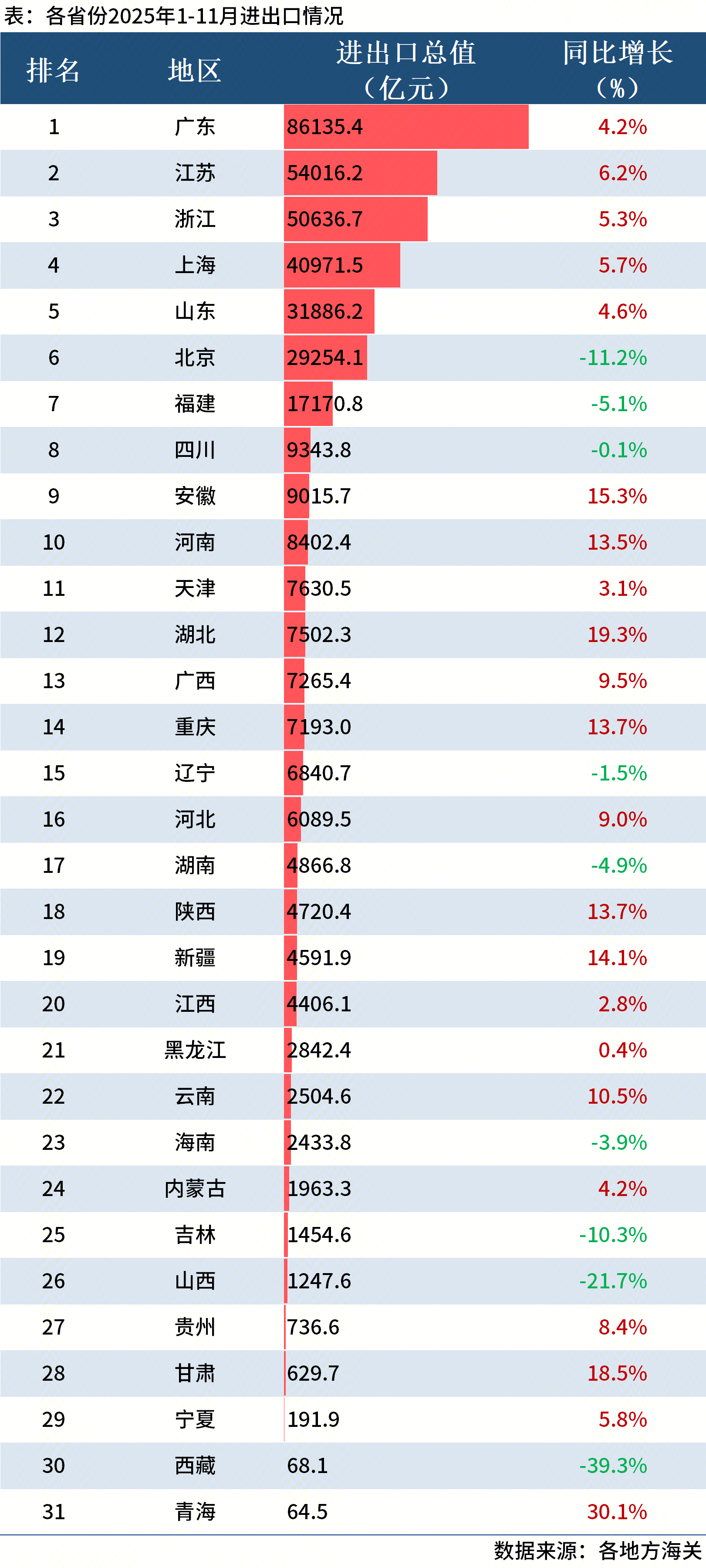 31省份2025年1-11月外贸进出口情况出炉。从进出口总值来看,广东2025年1-11月进出口总值为86135.4亿元,超8万亿元,排名第一;江苏54016.2亿元,排名第二;浙江50636.7亿元,排名第三。 从同比增速来看,19个省...24