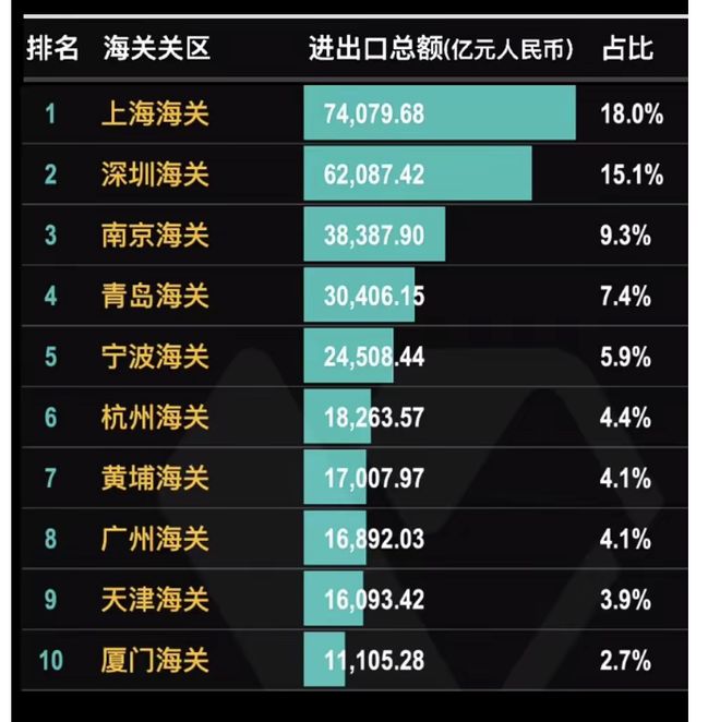 1-5位:上海海关、深圳海关 、南京海关、青岛海关和宁波海关。上海和深圳位列前二没有争议,作为华东和华南的中心城市,海关进出口总额规模也非常惊人;南京海关凭借黄金水道长江的优势,成为唯二的位于内陆的海关;青岛海关位于北方,其海关进出口总额甚...10