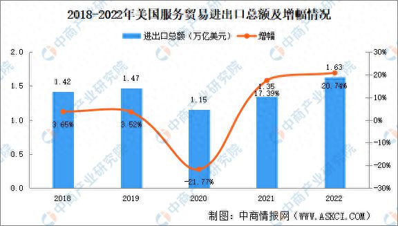 中商情报网讯:2022年,美国服务贸易总额为1.63万亿美元,同比增长20.74%。其中,进口额为6967.07亿美元,同比增长27.27%。出口额为9285.30亿美元,同比增长16.25%。贸易顺差2318.22亿美元,同比减少8.0%...30