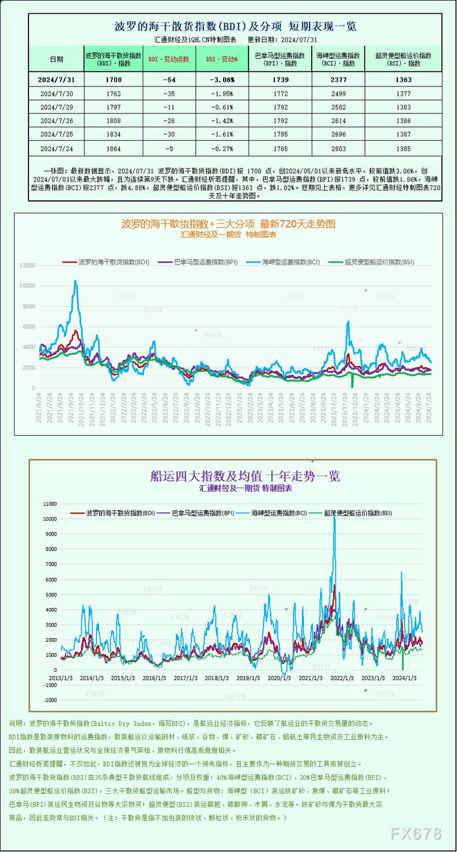 最新数据显示,2024/07/31波罗的海干散货指数(BDI)报1708点,创2024/05/01以来新低水平,较前值跌3.06%,创2024/07/03以来最大跌幅,且为连续第9天下跌。 汇通财经APP讯——最新数据显示,2024/07...07