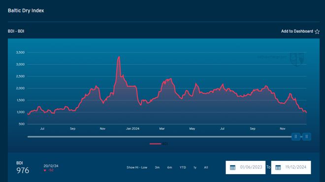 根据波交所为信德海事网提供的最新数据显示,更亮干散货船舶运价的波罗的海干散货运价指数(BDI)载昨天(周四)下跌了52点,跌破1000点至976点,为自2023年7月以来的首次低于这一关键心理关口。目前的BDI指数相较于11月中旬的高点已累...10