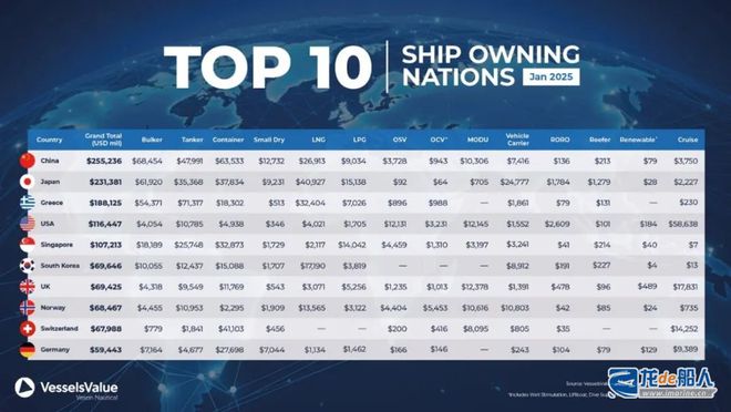 近日,VesselsValue发布了2025年最新的全球十大船东国榜,排名按受益船东国展示了现役及订购中船队的总资产价值。 从中国超越日本、以2550亿美元船队总价值位居榜首,到瑞士以680亿美元船队价值上榜,该报告强调了过去一年资产价...10