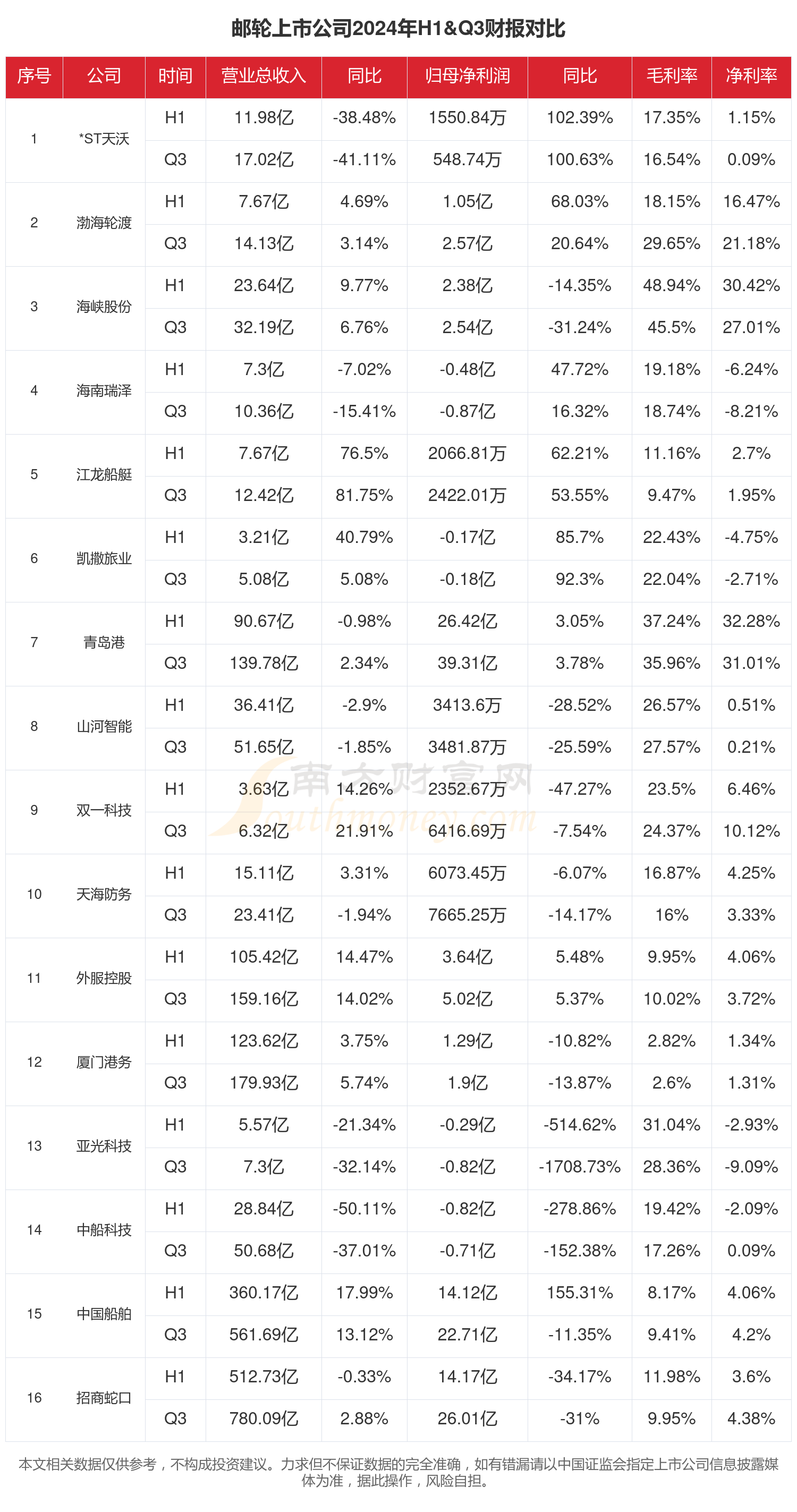 根据南方财富网概念查询工具数据统计,A股16家邮轮相关上市公司已发布2024年前三季度财报。2024年前三季度大家都过得怎么样?一起来看看吧。 中国船舶(600150):2024年第三季度季报显示,公司营业总收入同比增长5.35%至201...28