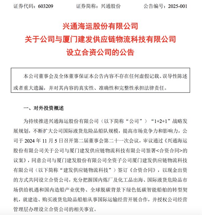 上海兴通链发航运有限责任公司正式成立,兴通股份持股51%,建发供应链物流科技持股49%。 2025年1月6日,由兴通海运股份有限公司(简称兴通股份)与厦门建发供应链物流科技有限公司(简称建发供应链物流科技)共同设立的合资公司——上海兴通链...24