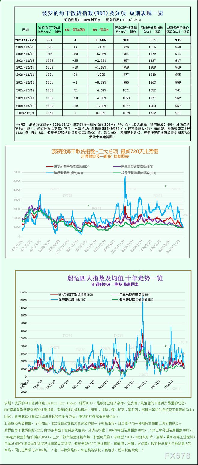 最新数据显示,2024/12/23 波罗的海干散货指数(BDI)报 994 点,创3天最高,较前值涨0.40%,且为连续第2天上涨。 汇通财经APP讯——最新数据显示,2024/12/23 波罗的海干散货指数(BDI)报 994 点,创3...11