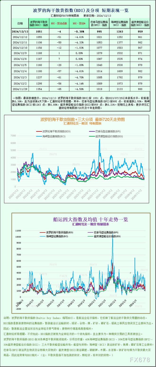 最新数据显示,2024/12/13波罗的海干散货指数(BDI)报1051点,创2023/07/25以来新低水平,较前值跌0.38%,且为连续第4天下跌。 汇通财经APP讯——最新数据显示,2024/12/13波罗的海干散货指数(BDI)报...19