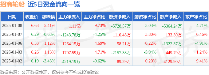 招商轮船(601872)1月8日主力资金净买入111亿元