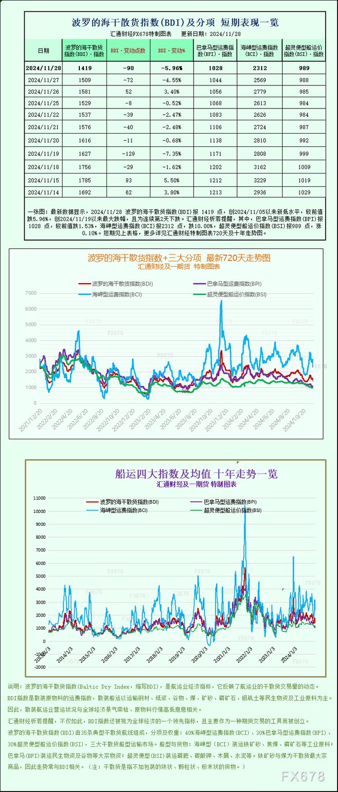 最新数据显示,2024/11/28波罗的海干散货指数(BDI)报1419点,创2024/11/05以来新低水平,较前值跌5.96%,创2024/11/19以来最大跌幅,且为连续第2天下跌。 汇通财经APP讯——最新数据显示,2024/11...01