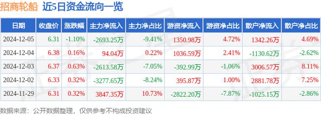 证券之星消息,截至2024年12月5日收盘,招商轮船(601872)报收于6.31元,下跌1.1%,换手率0.56%,成交量45.2万手,成交额2.86亿元。 12月5日的资金流向数据方面,主力资金净流出2693.25万元,占总成交额9....07