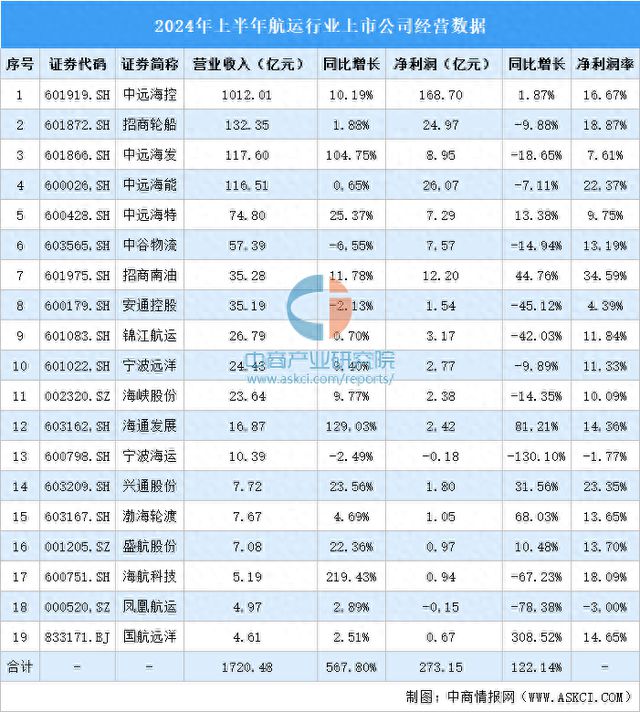 中商情报网讯:2024年上半年,航运行业19家上市公司合计实现营收1720.28亿元,同比增加567.80%;合计净利润273.15亿元,同比增加122.14%。其中,营收前十的公司分别为中远海控、招商轮船、中远海发、中远海能、中远海特、中...06