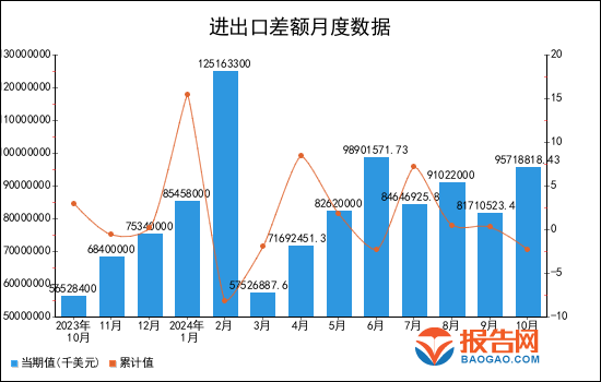 九游会J9:2024年1-10月全国进出口差额统计分析