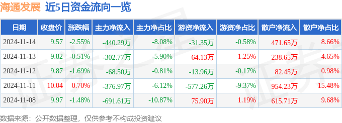 J9九游会:股票行情快报:海通发展(603162)11月14