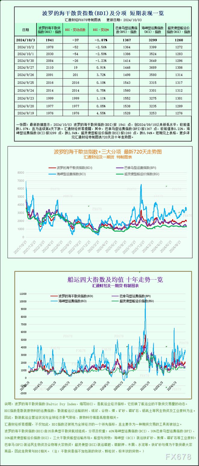 最新数据显示,2024/10/03波罗的海干散货指数(BDI)报1941点,创2024/09/18以来新低水平,较前值跌1.87%,且为连续第4天下跌。 汇通财经APP讯——最新数据显示,2024/10/03波罗的海干散货指数(BDI)报...30