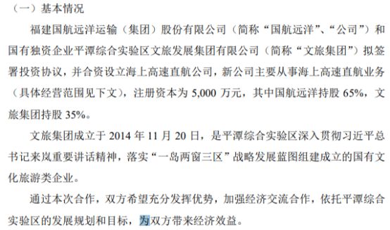 挖贝网10月8日,国航远洋(833171)近日发布公告,福建国航远洋运输(集团)股份有限公司(简称“国航远洋”、“公司”)和国有独资企业平潭综合实验区文旅发展集团有限公司(简称“文旅集团”)拟签署投资协议,并合资设立海上高速直航公司,新公司...09