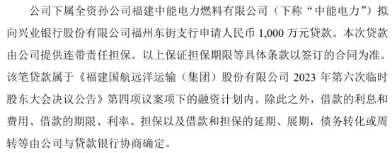国航远洋下属全资孙公司中能电力拟向银行申请1000万贷款公司
