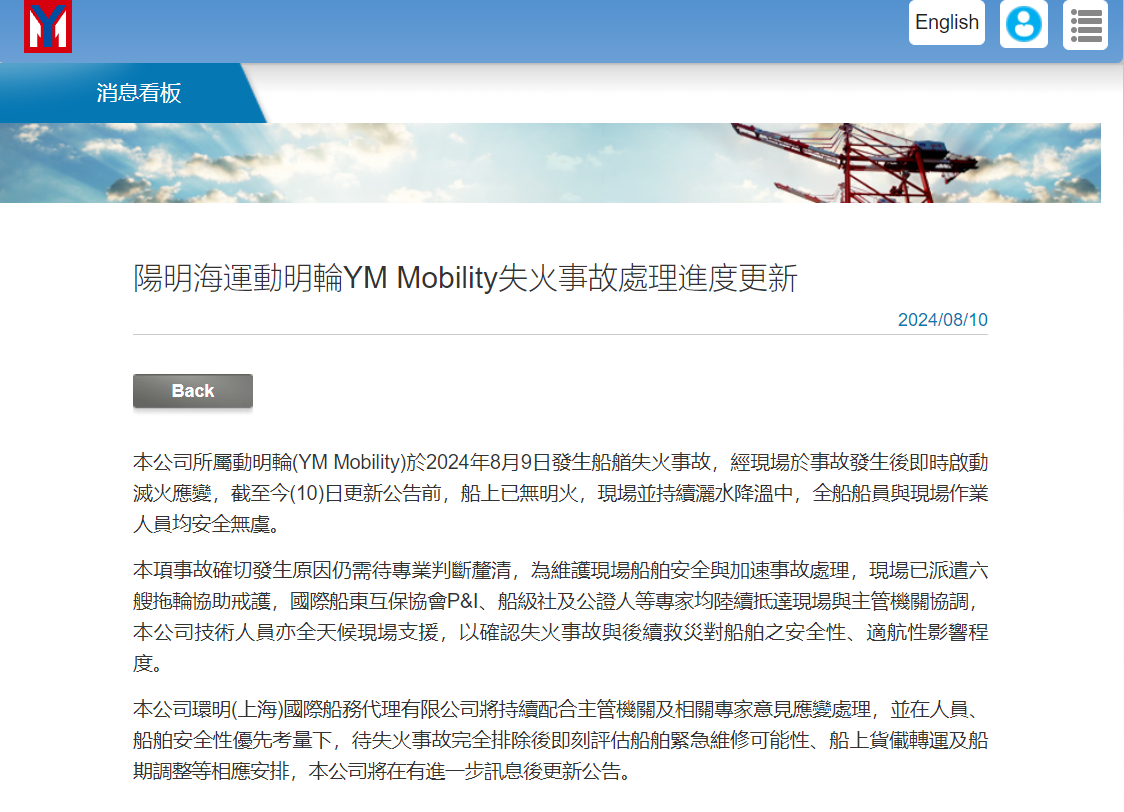 8月10日,阳明海运就旗下“动明”轮(YM Mobility)装载的集装箱失火一事,发布了事故处理进度公告。 公告中提到,事故现场实时启动灭火,截至8月10日新公告发布前,船上已无明火,现场持续洒水降温,全船船员与现场作业人员均安全。 ...22